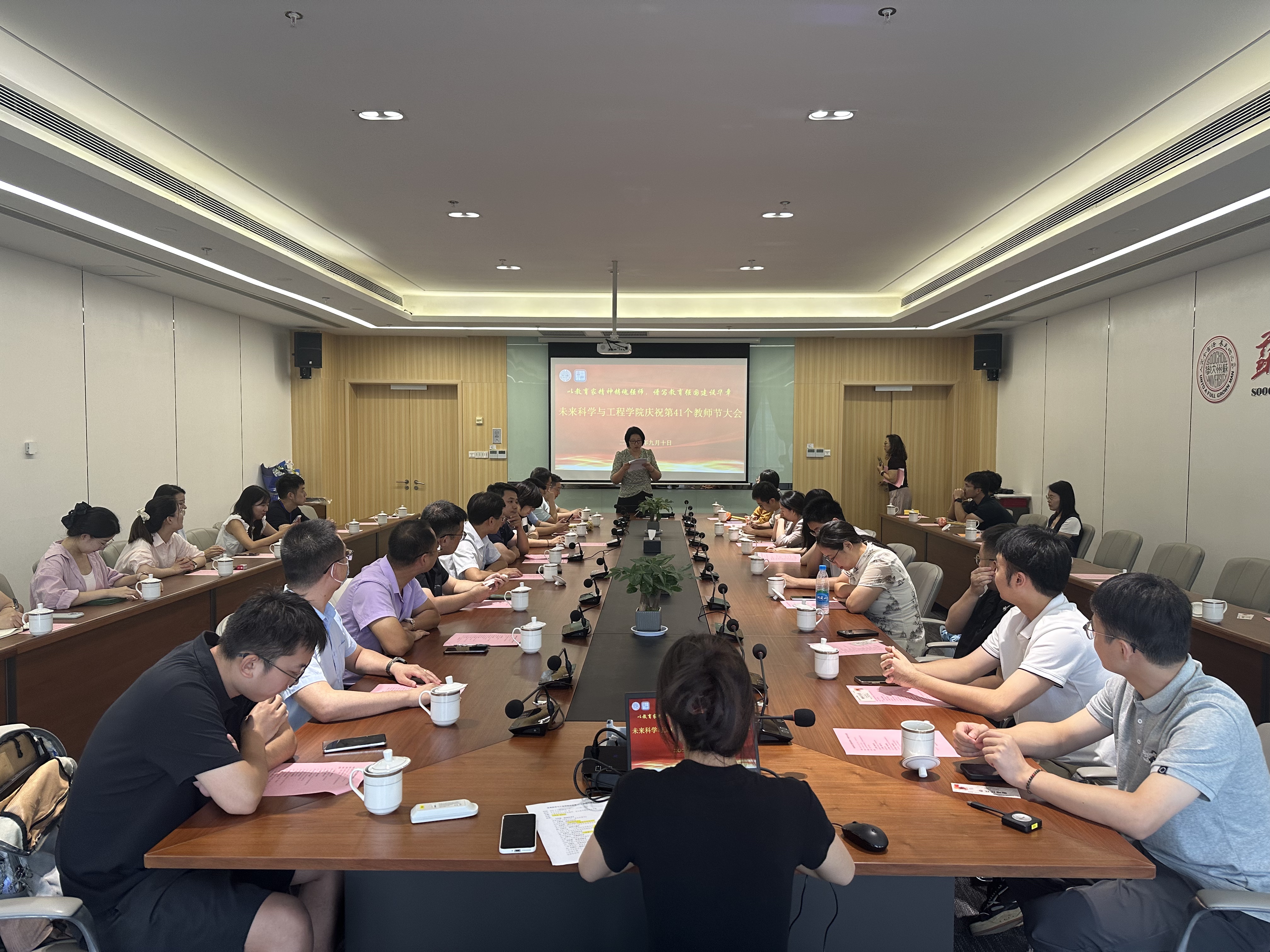 在第41个教师节来临之际,9月10日,未来科学与工程学院召开“以教育家精神铸魂强师,谱写教育强国建设华章”主题教师节大会,为新入职的教师拉开启航序幕。学院全体教职工参加会议,会议由副院长丁妮妮主持。